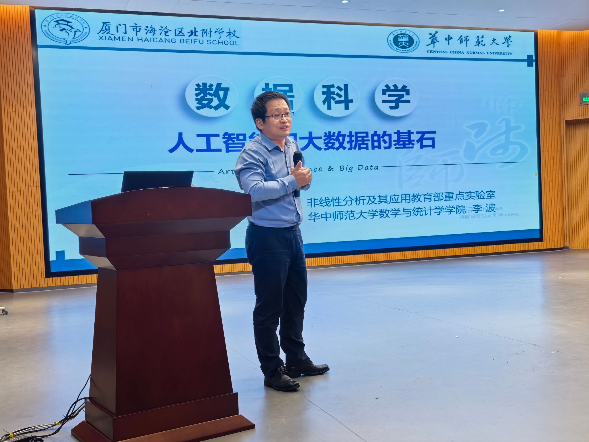 11月5日下午,“综合实践”主题教研活动在该校励耘讲堂举行。活动由海沧区北附学校数学教研组长陈磊老师主持,分为示范课展示、主题理解与课后反思、专家联合点评、专家主题报告四个环节。优秀青年教师陈靖涛以《确定匀质薄板重心位置》为课题,呈现一节精彩的数学教学示范课。主题理解与课后反思结束后,漳州市第八中学郑秋月、海南省教育研究培训院房一登、三明教育学院黄和悦进行了联合点评。李波教授为陈靖涛老师颁发授课证书,并作了题为《数据科学、人工智能和大数据的基石》的指导讲座,共同推动初中数学“综合与实践”领域教学发展。