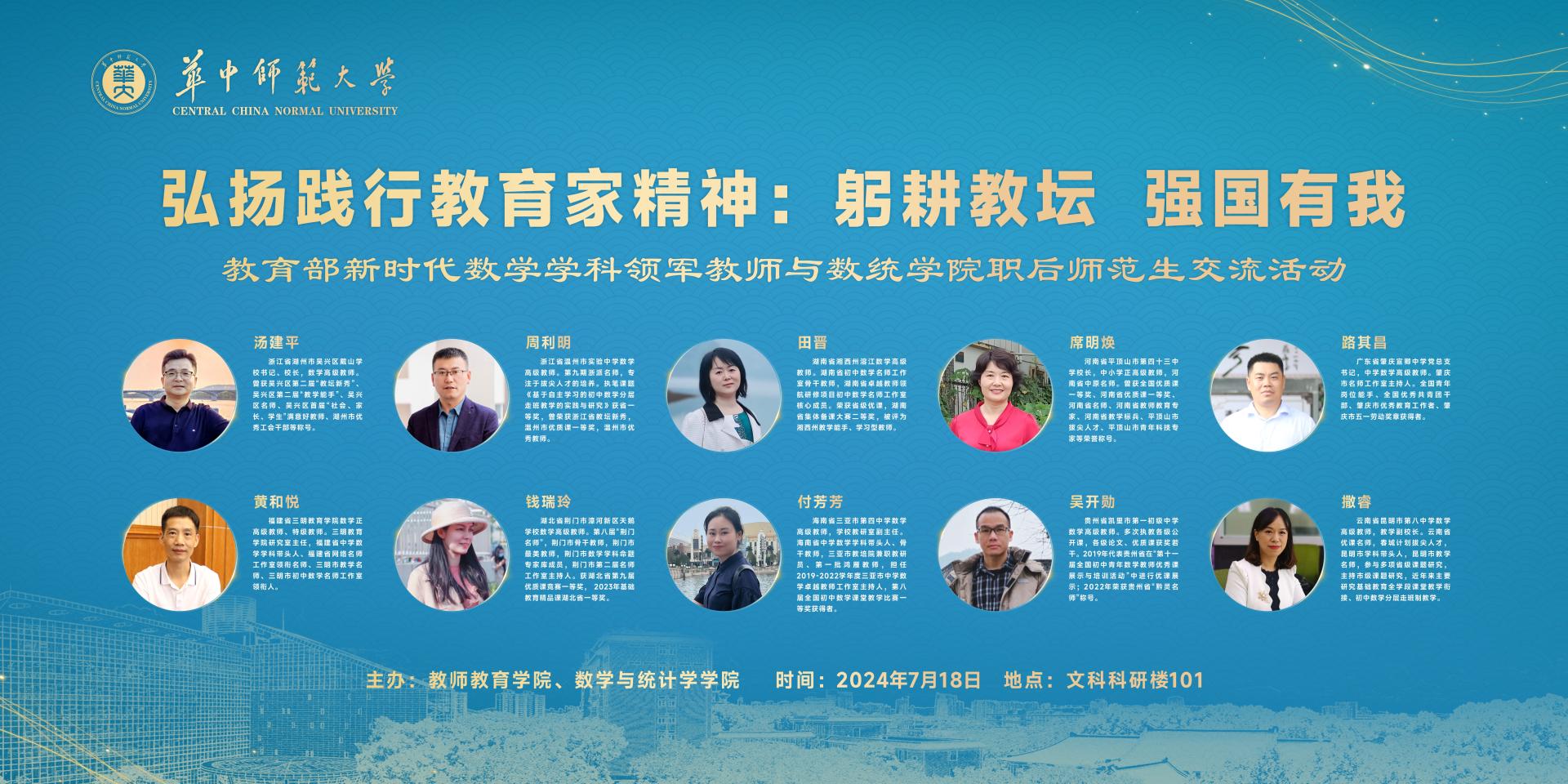 为进一步弘扬和践行教育家精神,推进我校师范生职前职后融通一体化培养,2024年7月18日,由教师教育学院、数学与统计学学院联合主办的教育部新时代学科领军教师与数学公费师范生教育硕士(青年教师)的分享交流活动在新文科科研楼成功举办。