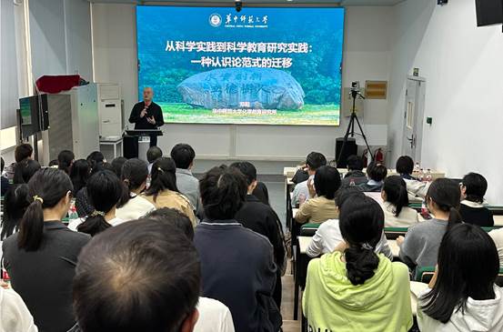 化学学院邓阳教授首先作了主题报告。他清晰地阐释了科学实践的概念和类型,指出科学实践是产生并解决科学复杂问题的过程。推理、证据推理是其关键要素。通过不同学科案例,邓教授深入论证了科学解释和科学论证的耦合关系,揭示了如何建立、论证和确证尝试性解释。最后由科学实践转向科学教育研究实践,并论证科学实践和科学教育研究实践可以进行一种认识论范式的迁移。