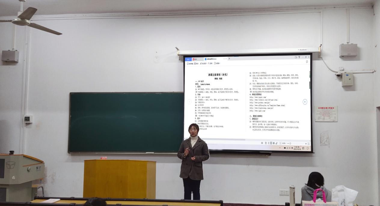 韩茜就课前准备特别强调,PPT的配色、字体和设计要有所讲究,上课的服装仪容应端庄大方,教学语言要有艺术感。她还指出了应对课堂突发情况的处理措施。