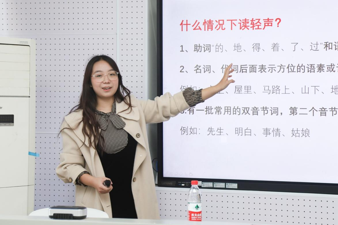 杨骥瑶根据同学们的反应和要求讲解了声母、韵母、前后鼻音等发音的正确方法,与同学们现场进行了相关字词的练习与互动,收获很好的反响。