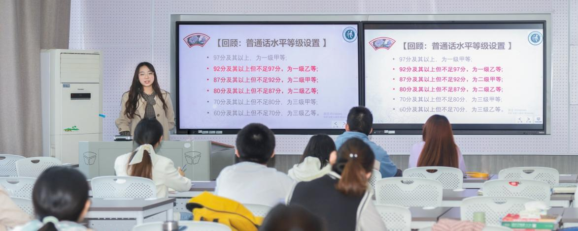 杨骥瑶以“北方”“纺织”等字词,引出语流音变“上声的变调”这一考点。她带领同学朗读词组,分析变调,轻声,儿化等音变。她与同学们一起回顾普通话测试“读单音节字词”“读双音节词语”“短文朗读”“命题说话”四个内容。她强调整个测试过程中应注意控制语速,测试一二题注意横向顺序朗读,切忌串读回读,可以用手指记录朗读进度;测试第三题不能一字一顿,也不能感情过度;测试第四题应注意主题的选择并做好相关内容的素材储备。她通过播放一段说话音频,让同学们了解命题说话环节逻辑组织的重要性。