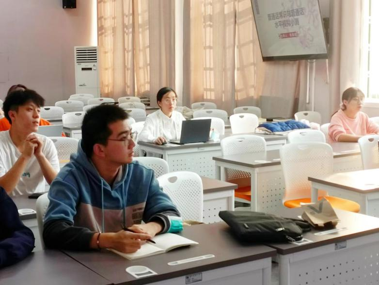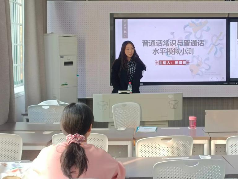 杨骥瑶从普通话测试、培训和主讲人选拔三方面展开培训。她向推普员们介绍了四次师范生普通话培训课程的设置,以普通话培训第一讲“普通话常识与普通话水平模拟测试”为例,详细介绍了课程导入方法、普通话与方言的关系、普通话水平测试的流程与注意事项等系列知识,明确了普通话培训第一讲的基本框架,提出了提升课堂效果的相关建议,现场为成员们答疑解惑。