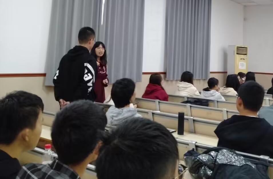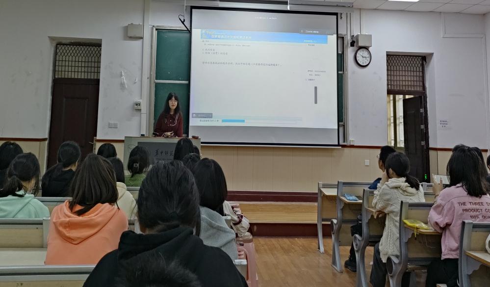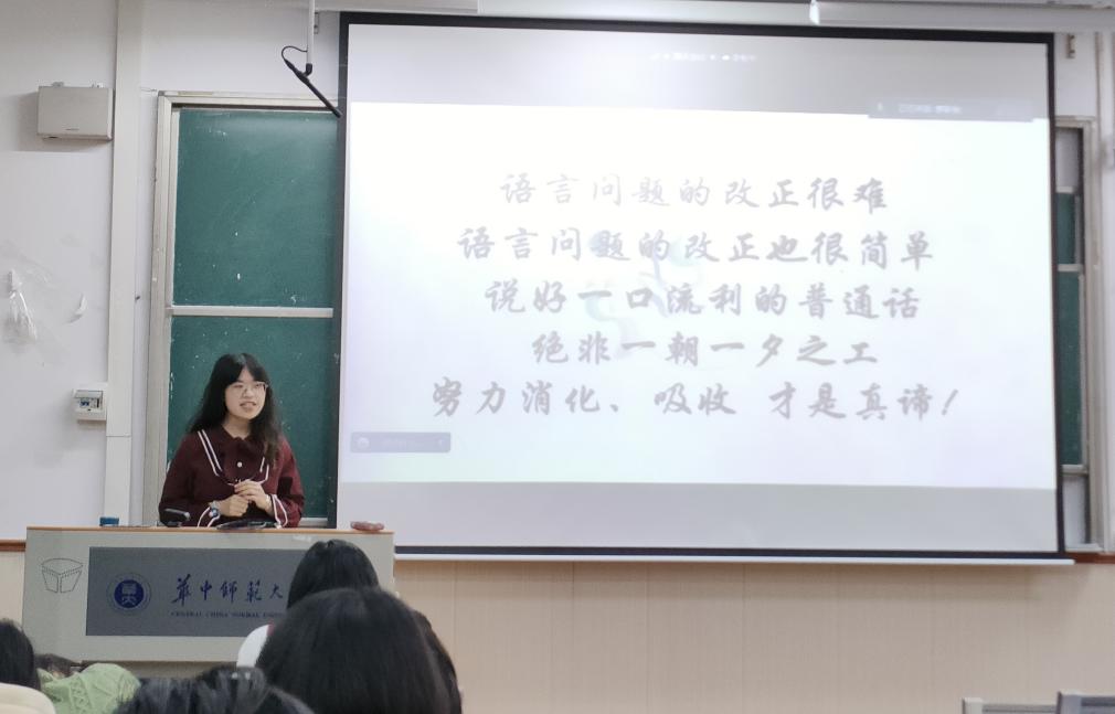 语言常识普及环节,宋佳蓓邀请同学用家乡方言朗诵诗词《早春呈水部张十八员外》,并播放诗词朗诵视频以及方言歌曲,带领同学们漫游诗词歌赋,领略祖国各地方言的魅力。意犹未尽之余,宋佳蓓对汉语分类和普通话的基本常识进行普及,并以视频形式介绍语言的历史流变。课堂结尾,宋佳蓓强调,说好普通话绝非一朝一夕之事,努力消化、吸收才是真谛,并鼓励同学们平时要多多练习普通话。