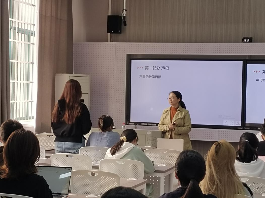 陈蓓具体讲授了声调的调值、调类、调型以及相关教学方法,通过“施氏食狮史”“耕地要用犁”等有趣的短文诵读,引导同学们感受单字认读、词语句段连读时声调的变化。她提醒同学们在具体教学时,可以根据教学对象方言的差异,灵活安排教学重点。