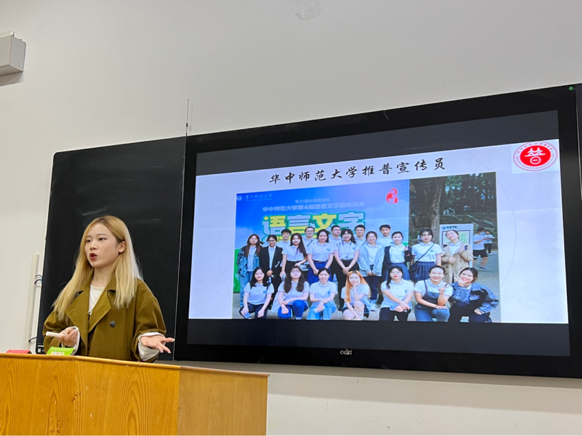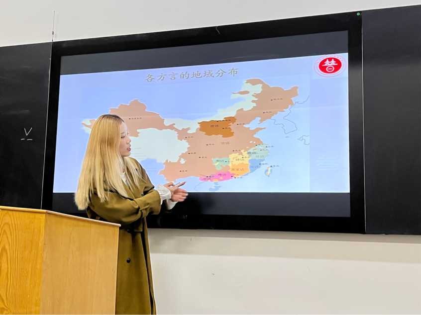 周舒林以同学们的不同口音为切入点,介绍了方言的历史发展和地区分类,播放了三段有关方言的视频,声图结合,为同学们生动形象地展示了中国各地方言的丰富多样和独特魅力。她幽默诙谐的语言,令现场爆笑不断,学生兴致高涨。